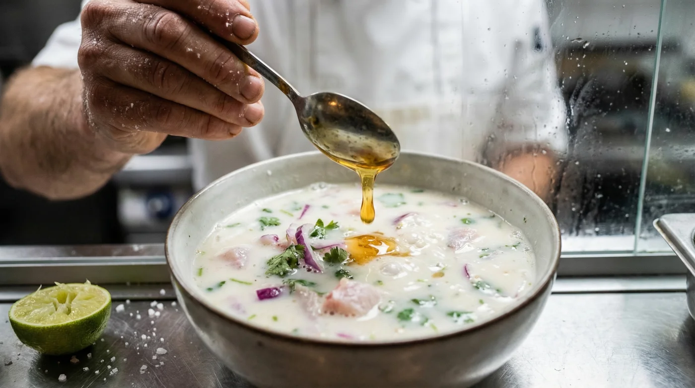 Gently fold the balanced liquid back into your seafood, red onions, and cilantro. Place the bowl back into the refrigerator for exactly 5 minutes. This brief resting period allows the newly harmonized leche de tigre to penetrate the outer layer of the fish without further breaking down the protein structures. Serve immediately with crisp plantain chips or toasted corn, confident that your expert knowledge of culinary chemistry has saved the day.