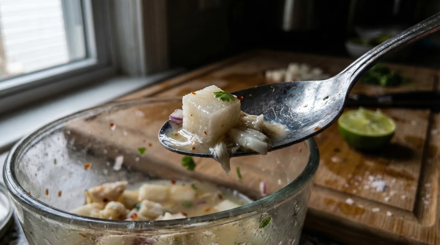 Conversely, the cellular structure of jicama is highly resistant to acid degradation. The strong pectin bonds do not break down in the presence of citric acid. Instead, the porous nature of the vegetable acts like a microscopic sponge. Through the process of osmosis, the highly concentrated, flavorful leche de tigre is pulled directly into the vegetable’s cells. This means that every single bite of the root delivers a burst of citrus, salt, and seafood essence, perfectly mimicking the experience of biting into a premium piece of marinated crab meat. Experts advise that understanding this osmotic potential is crucial for troubleshooting common errors in the preparation process. To ensure your dish is flawless, you must pay attention to the fundamental diagnostic signals of a failing cure.
