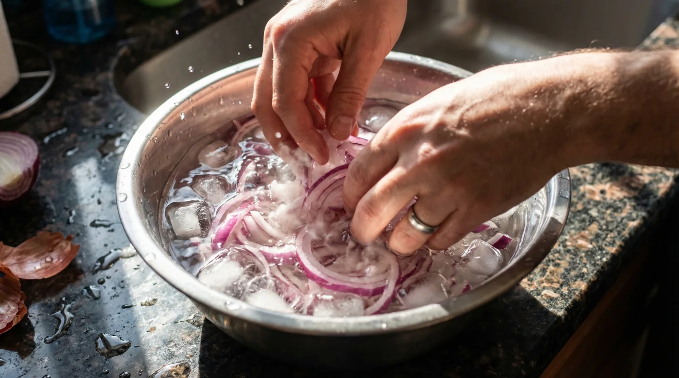 For optimal results, use a sharpened chef’s knife or a mandoline to slice your red onions to a precise 1/8-inch thickness to maximize exposed surface area without compromising the structural integrity of the rings. Submerge these fresh slices in a large glass mixing bowl containing exactly 2 cups of clean, cold Tap Water mixed vigorously with 1 cup of solid ice cubes. This highly specific ratio rapidly drops the ambient temperature of the bath to roughly 35 degrees Fahrenheit. Allow the slices to soak completely undisturbed for exactly ten minutes. This exact 10-minute duration provides just enough time for the harsh, pungent sulfur compounds to leach out into the highly solvent liquid, completely washing away the bitter sting while firmly locking down the rigid cellular walls that provide that coveted, satisfying crunch.